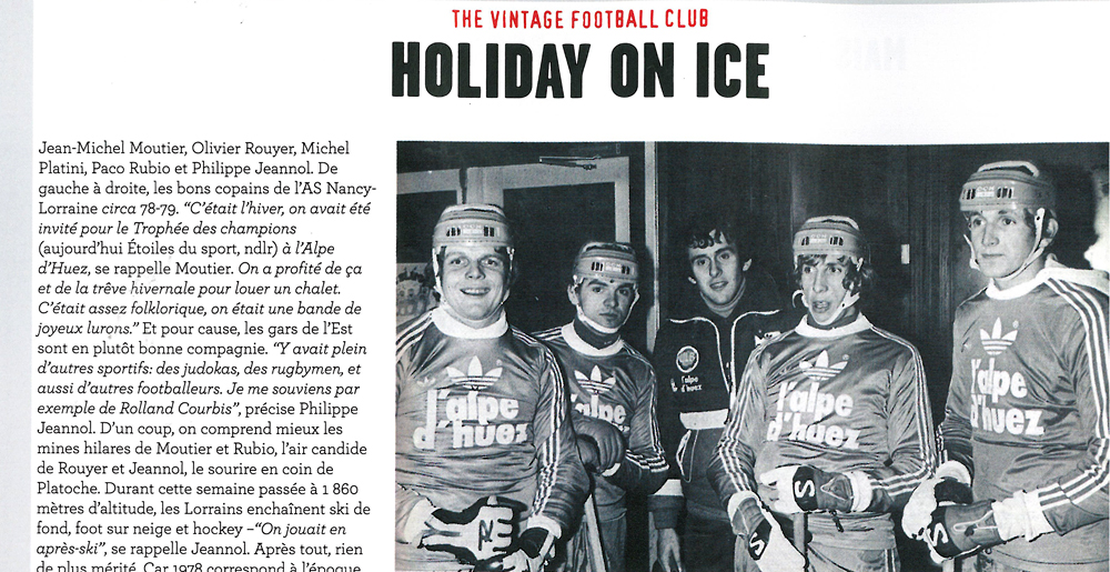 Dans son dernier numéro avec Neymar en couverture (3,90€ en kiosque), le mensuel So Foot publie une photo méconnue de joueurs de l’ASNL période 1978/1979. On y voit en effet Jean-Michel Moutier, Olivier Rouyer, Paco Rubio et Philippe Jeannol en tenue de hockeyeurs. Un peu en retrait, Michel Platini y apparait en survêtement. « C’était l’hiver, on avait été invité pour le trophée des champions à l’Alpe d’Huez, raconte Jean-Michel Moutier. On a profité de ça et de la trêve hivernale pour louer un chalet. C’était assez folklorique, on était une bande de joyeux lurons. »