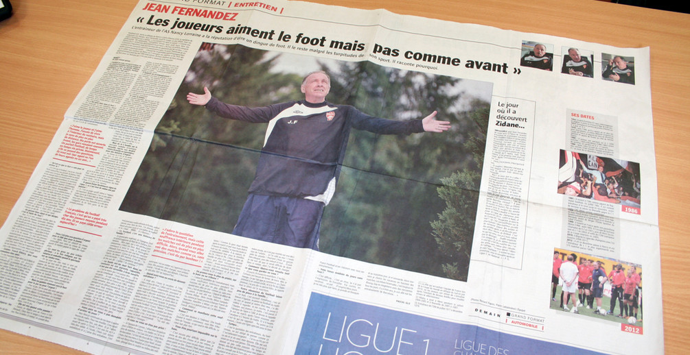 Ce lundi, le quotidien l’Équipe publie une double page sur Jean Fernandez. Dans ce grand format, l’entraîneur nancéien parle du changement de mentalité des joueurs professionnels, raconte sa passion du foot mais aussi sa souffrance intérieure pendant les matchs. « C’est une douleur à l’intérieur. Une boule. Quand le match commence, vous êtes tributaire de l’équipe, ce qui rend le rôle difficile. Le cœur bat plus fort. » Il en profite également pour expliquer comment il est devenu impassible sur un banc de touche. « Quand j’étais jeune entraîneur, si vous m’aviez vu sur le banc à Cannes ! J’étais complètement barjot, je m’en prenais à tout le monde, j’étais tout le temps en commission de discipline (…) Et puis je me suis dit que ce serait difficile de durer dans ce métier, alors j’ai décidé de changer. »