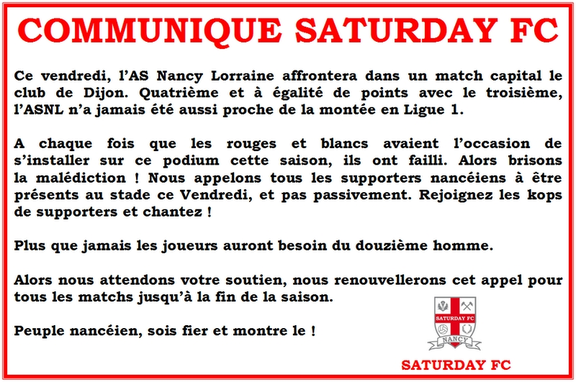 Pour briser la malédiction qui semble empêcher l’ASNL de grimper sur le podium, le groupe Saturday FC lance un appel à la mobilisation de tous les supporters nancéiens. « Plus que jamais les joueurs auront besoin du douzième homme ».