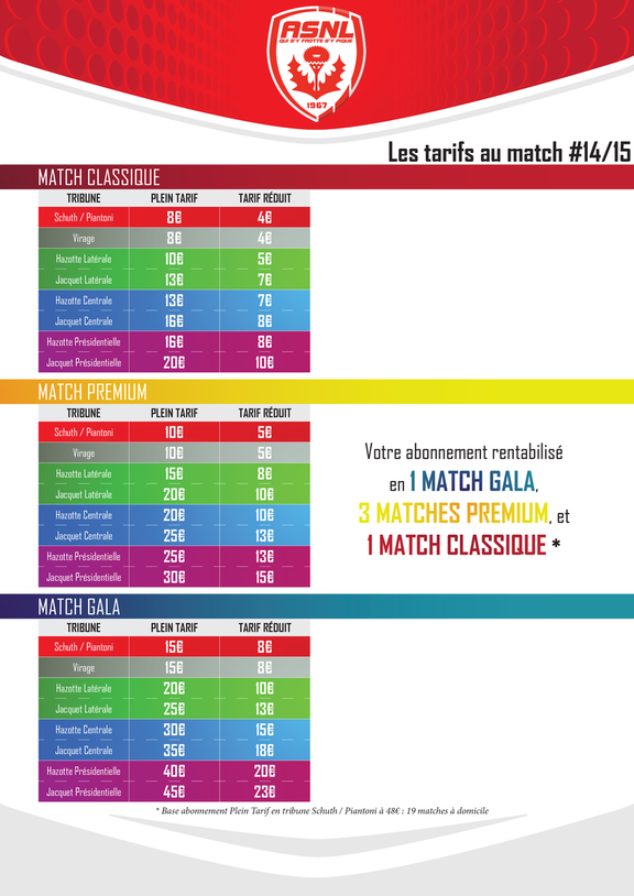 Comme tous les ans, l'ASNL vous dévoile en amont les tarifs Billetterie qui seront pratiqués lors de la saison en fonction des affiches, du classement de l'équipe adverse, ou encore de la programmation.