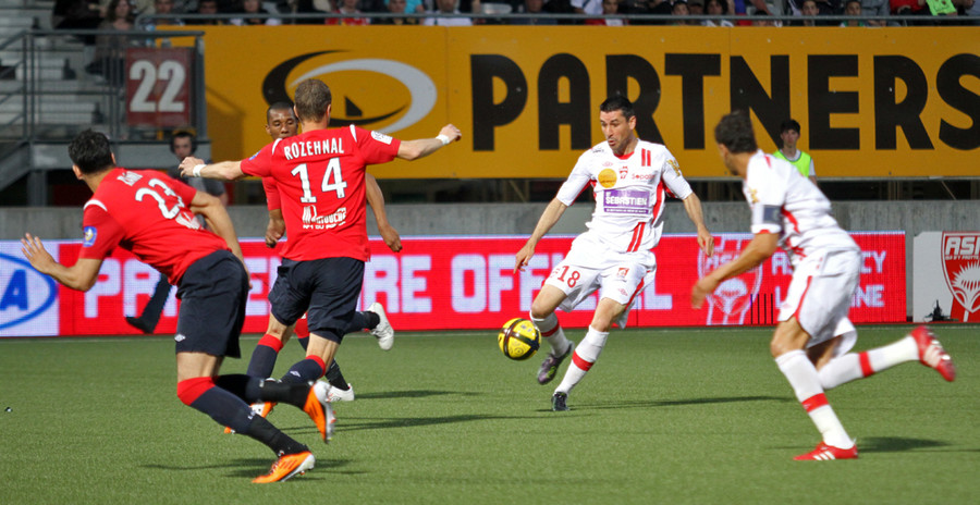 Face au leader du championnat, Pablo Correa a choisi de renforcer son milieu de terrain et de relancer Pascal Berenguer, absent du onze de départ depuis presque trois mois. Le Corse de l’ASNL entame la rencontre avec beaucoup de fougue et comme une première faute après quelques secondes de jeu. Le ballon arrive finalement sur Mathieu Debuchy qui centre au point de penalty. La reprise de la tête de Tulio De Melo est captée par Damien Gregorini (2’).