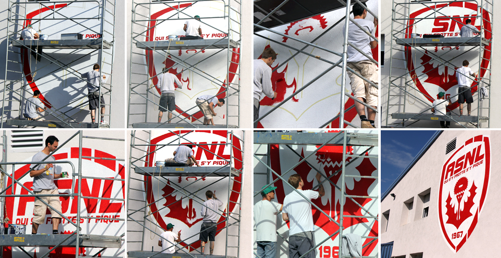 Le bâtiment principal du centre de formation et d’entraînement de l’AS Nancy-Lorraine arbore depuis ce vendredi midi le nouveau logo du club. Deux demi-journées ont été nécessaires à trois personnes de la société Dalmolin pour réaliser cette magnifique peinture.