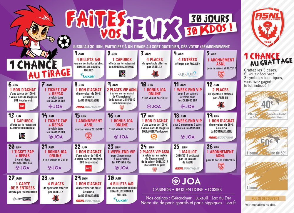 30 jours / 30 Kdos1 chance au grattage / 1 chance au tirage1 bon à gratter pour tenter de gagner des bonus JOA valables dans les casinos de Gérardmer, Luxeuil et du Lac du Der. Puis une 2ème chance au tirage pour tenter de gagner des cadeaux exclusifs auprès de nos nombreux partenaires (à récupérer à la Billetterie du stade à partir du 18/05/2016) ! EN SAVOIR + |