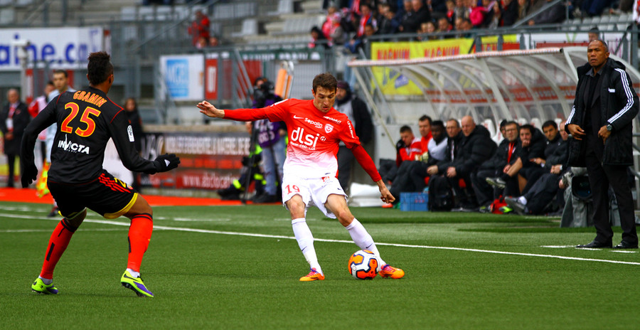 Un coup-franc de Valdivia dévié par le mur fait trembler Marcel-Picot (31’) puis Bourigeaud croise trop son tir (38’). L’ASNL est toutefois logiquement récompensée de sa première mi-temps en obtenant un penalty pour une grossière main de Kantari. La sanction est transformée à la Panenka par Cuvillier (39’). L’ex-Lensois est sur un nuage. Il élimine avec brio deux adversaires côté gauche. Son centre en retrait parfait est repris par Louis qui bute sur Aerola (45’).